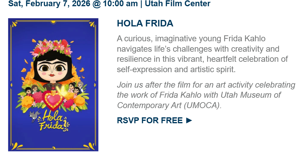 Come watch Hola Frida at Utah Film Center (375 W 400 N) for Neighborhood Movie Day, Saturday, February 7th at 10am. Join us after the film for fun art activities!